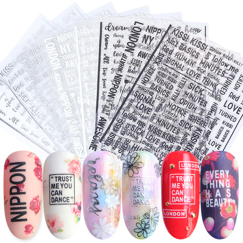 1 قطعة الفضة أسود أبيض الإنجليزية إلكتروني تصاميم موضة مسمار الشارات مانيكير ثلاثية الأبعاد ذاتية اللصق مسمار الفن ملصقات